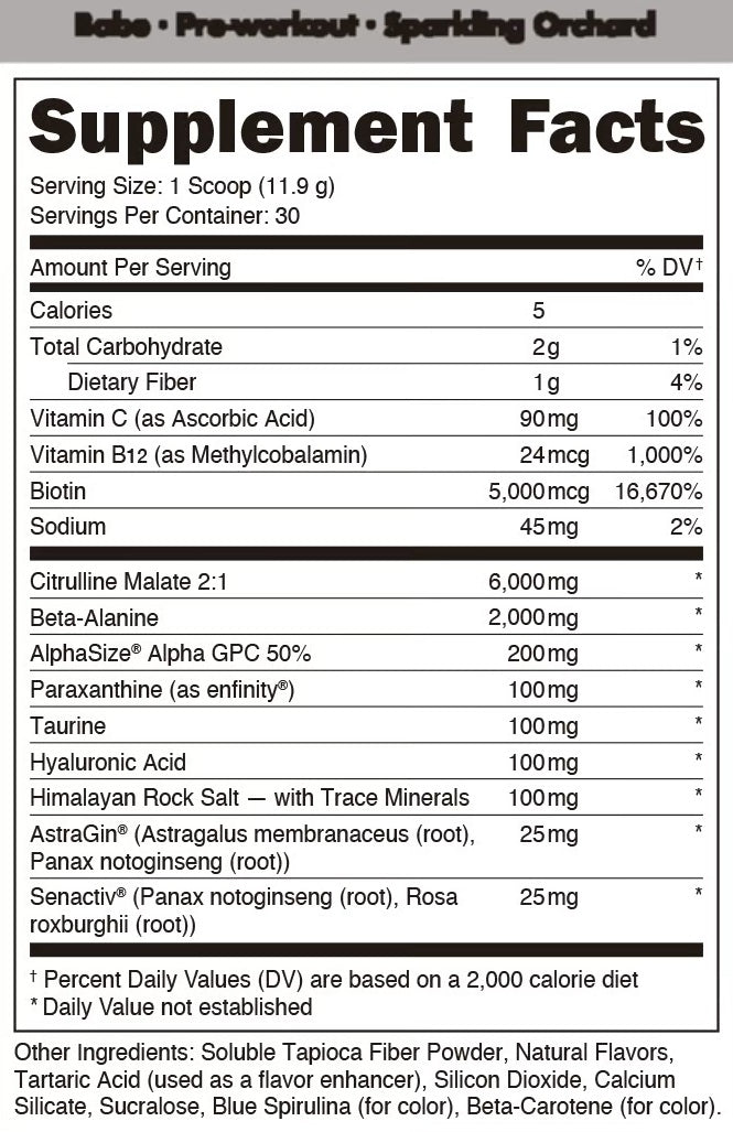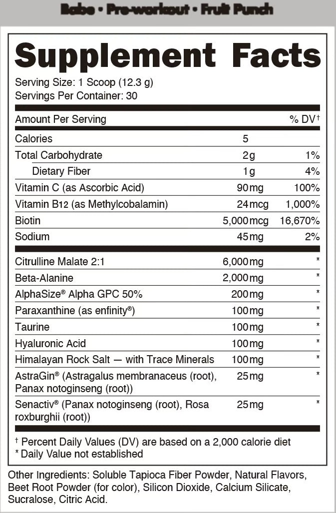 Suggested Use: Mix one scoop of Babe Pre-Workout into 6-8 ounces of water 20-30 minutes before your workout.