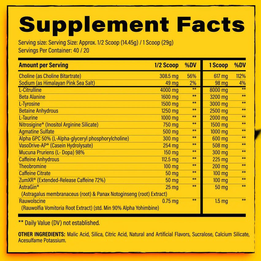 Suggested Use: Start with half a scoop of Deception to assess tolerance before increasing to a full scoop. Take one scoop with 12-16 ounces of water 15-30 minutes before your workout.