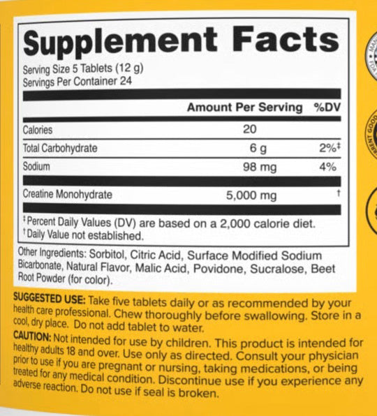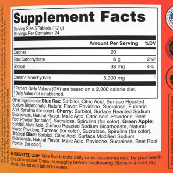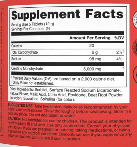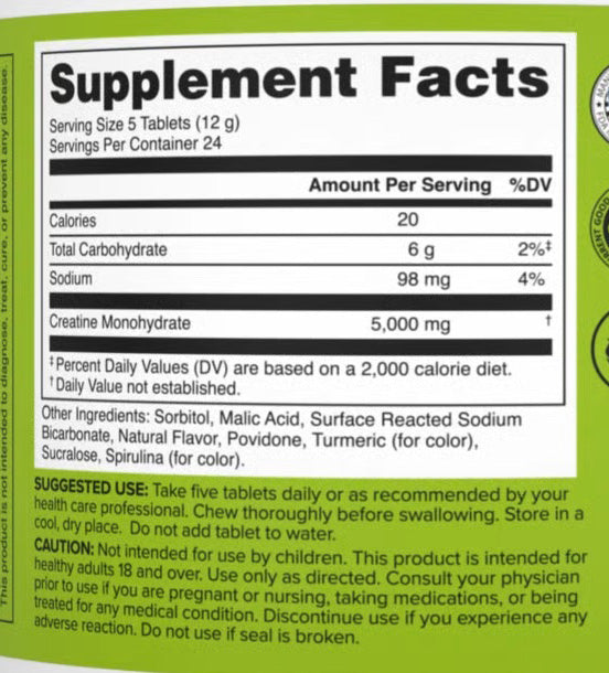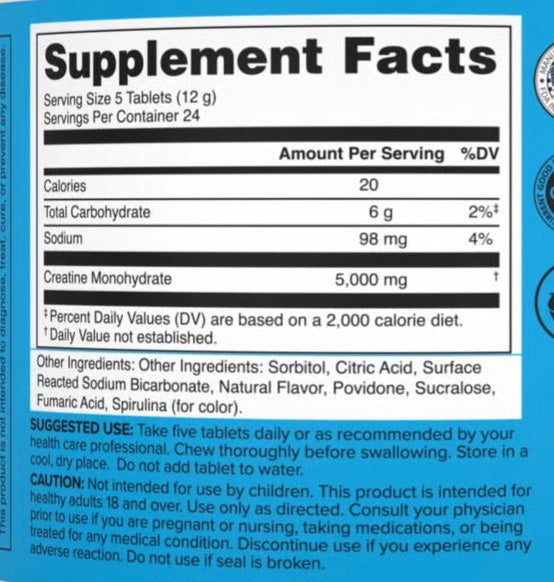 How to Use: Chew one full serving (providing 5 g of creatine monohydrate) daily. It can be taken any time of day, but for best results, consume it before or after your workout. On non-training days, take one serving at a consistent time to maintain muscle creatine levels. No loading phase is required—just use daily and stay well-hydrated. Do not exceed the recommended serving unless advised by a healthcare professional.