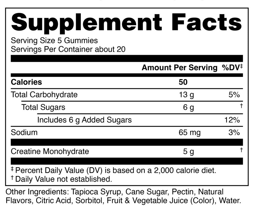 How to Use: Take one serving (usually 4–5 gummies) each day — chew thoroughly and swallow. It doesn’t require any mixing with water; just take it at a convenient time, such as before or after workouts, or with meals. Aim for consistent daily use to keep muscle creatine stores saturated, which supports strength, power, and recovery benefits over time.