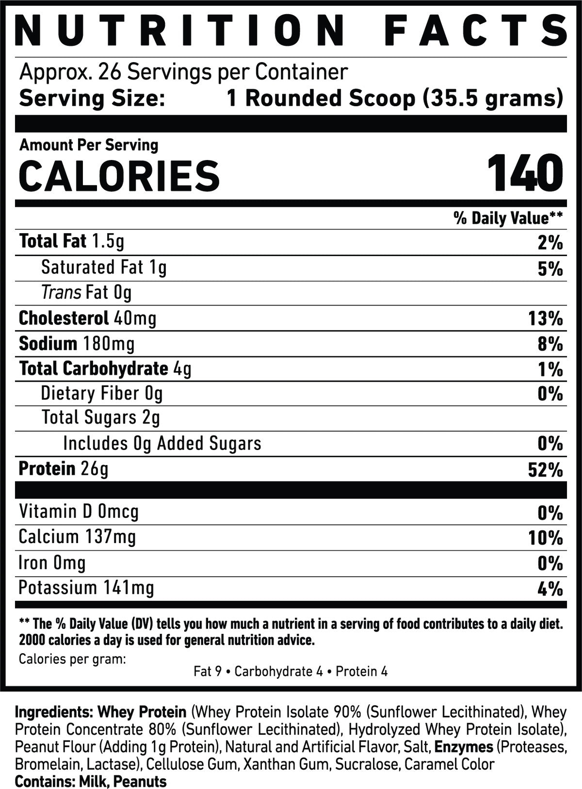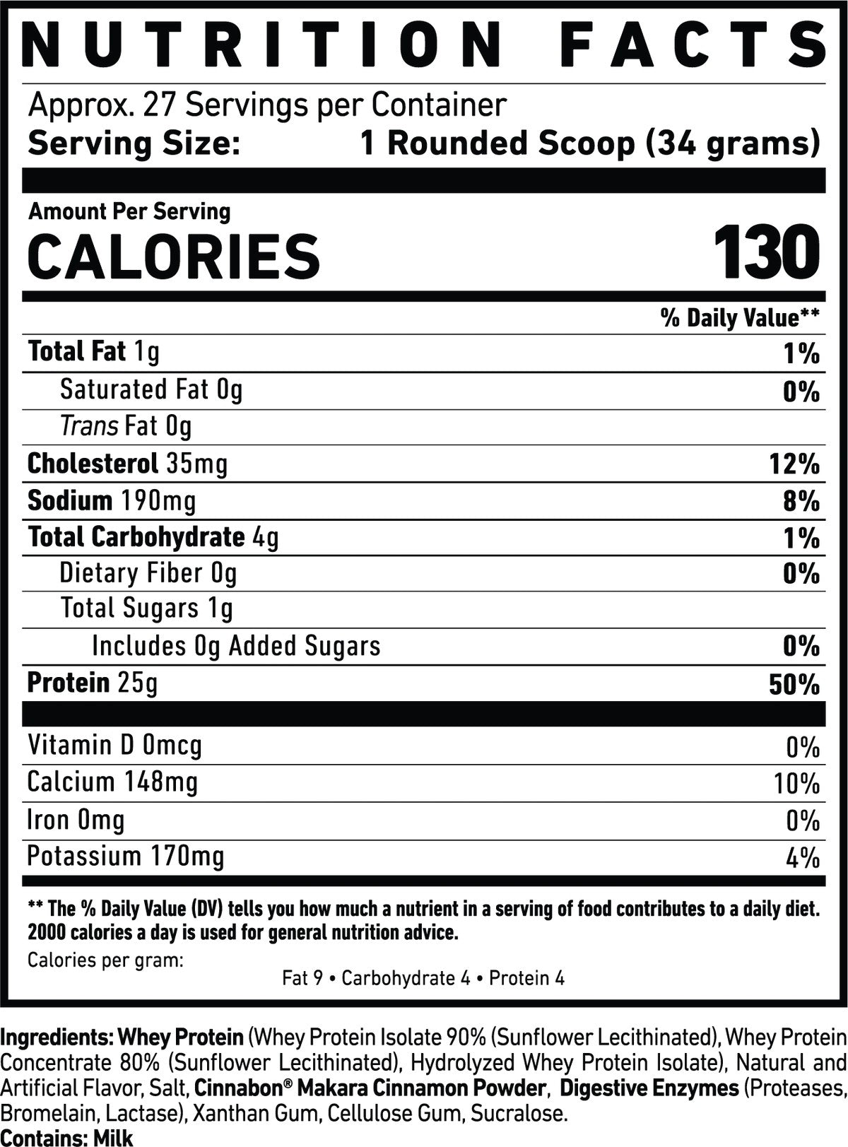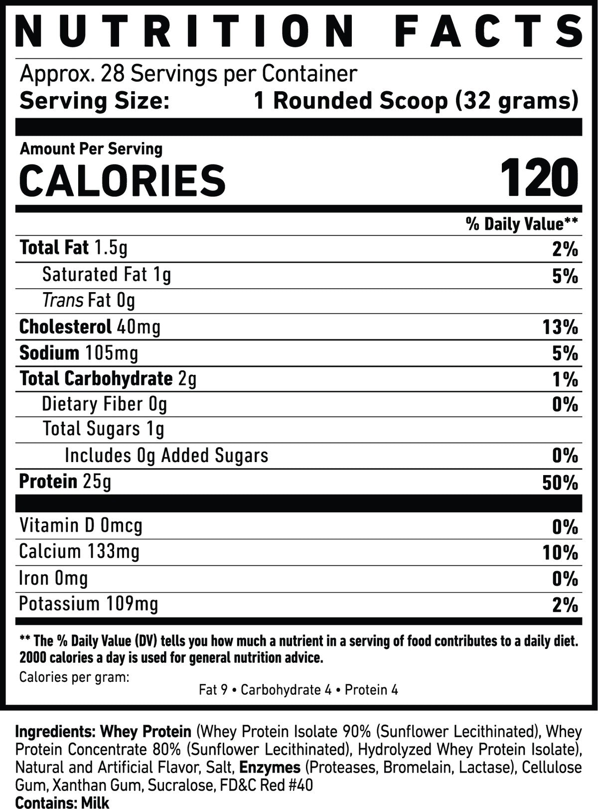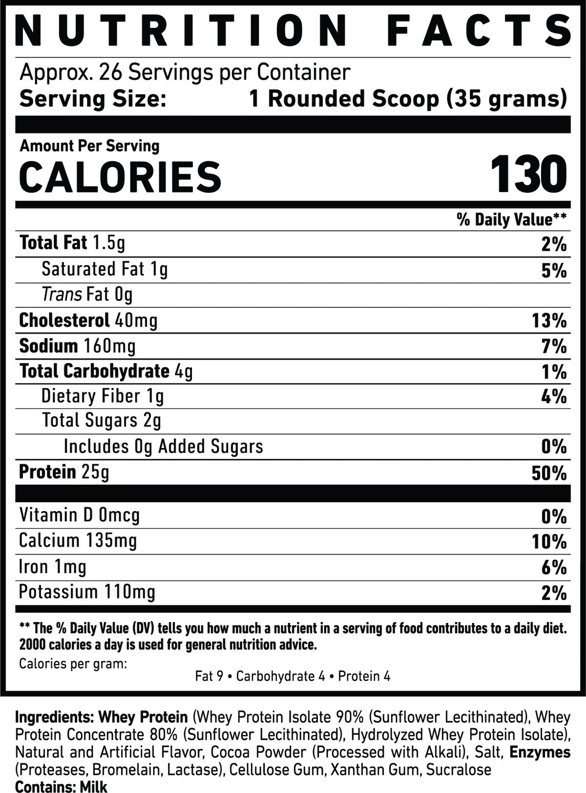 Typical nutrition per scoop is around 25 g of protein, with low fat and carbohydrates, making it suitable for most fitness goals.