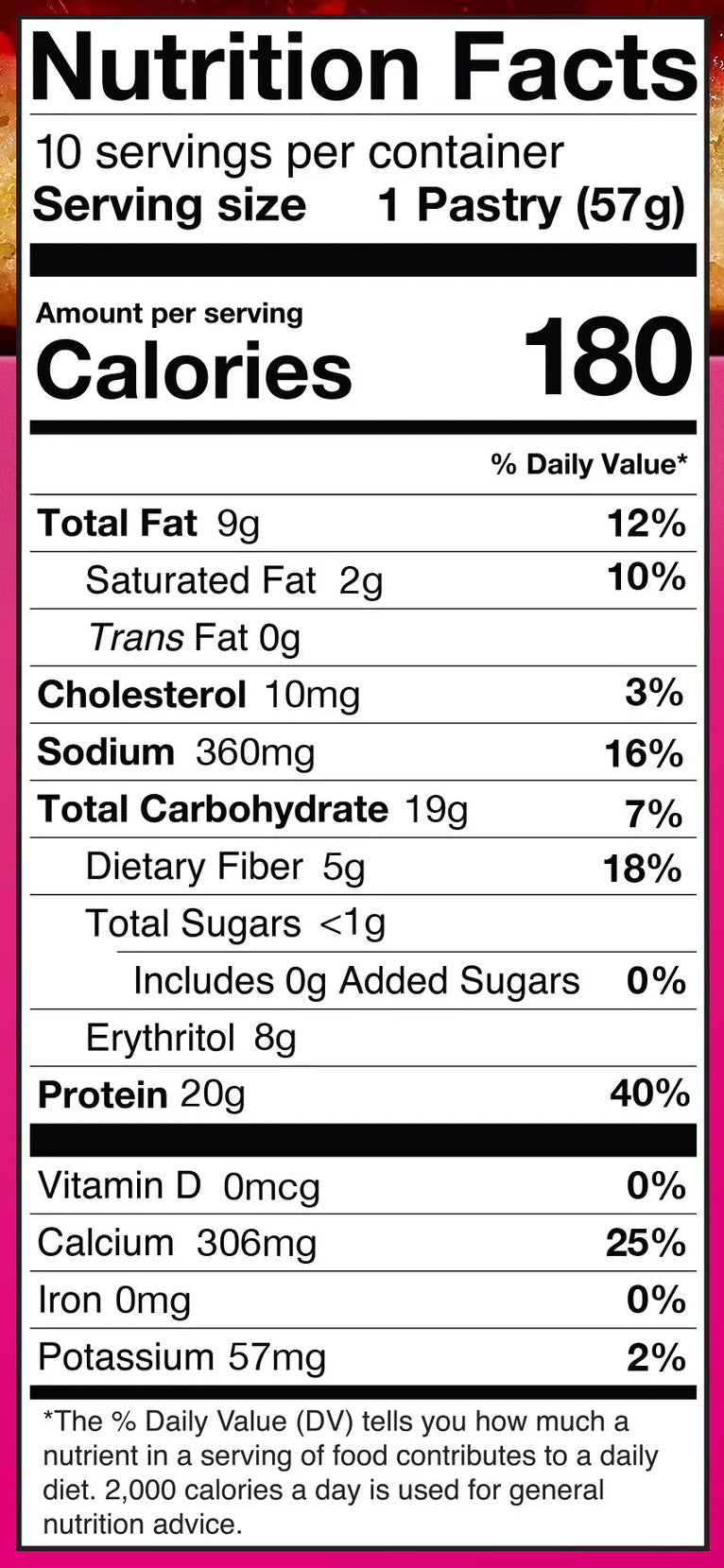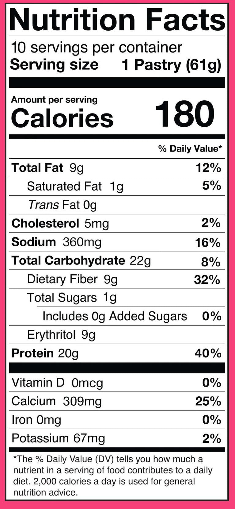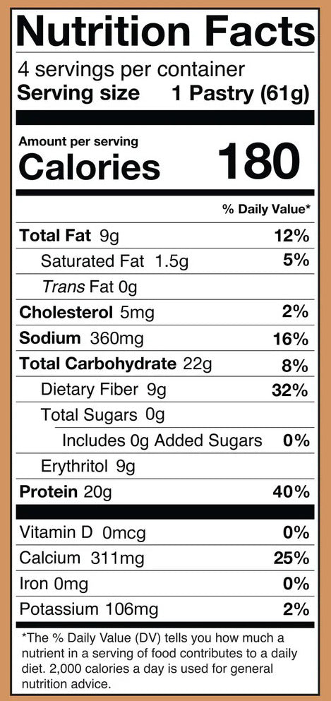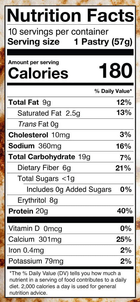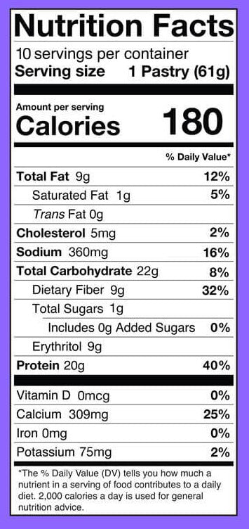 Each pastry contains approximately 180 calories, 20 grams of protein, 5 grams of net carbs, less than 1 gram of sugar, and 8 grams of fat.