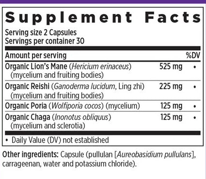 | Organic Chaga (Inonotus obliquus) (mycelium & sclerotia) | 125 mg | Mushroom known for antioxidant and overall health support.* |