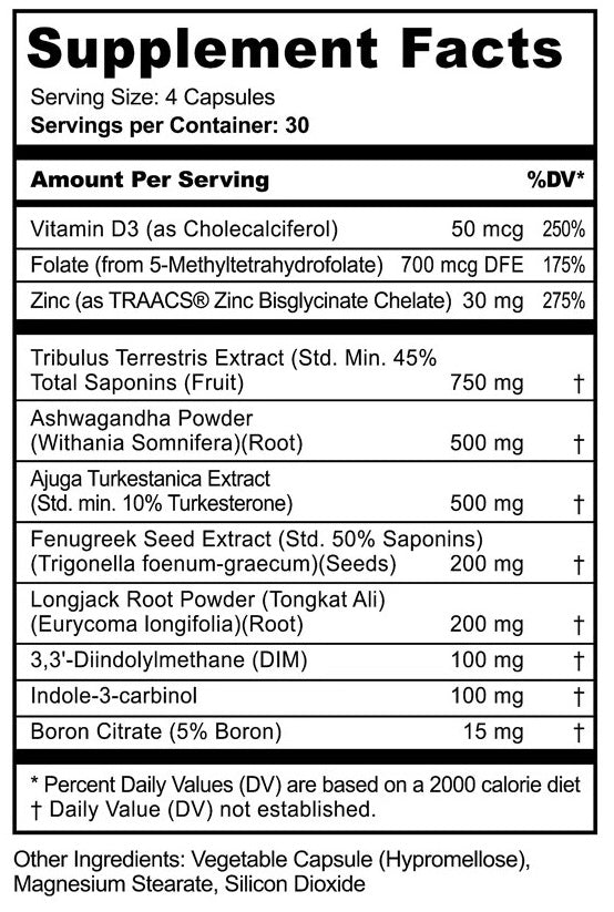 - Tribulus Terrestris Extract (~750 mg): Herbal extract widely used in traditional testosterone support formulations.