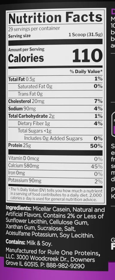 Rule One Proteins Casein Protein is a slow-release micellar casein protein powder formulated to deliver a steady supply of amino acids to your body over several hours. Made with 100% micellar casein, it’s thicker and digests more slowly than fast-absorbing proteins, making it ideal for nighttime use, between meals, or whenever you want long-lasting protein support.